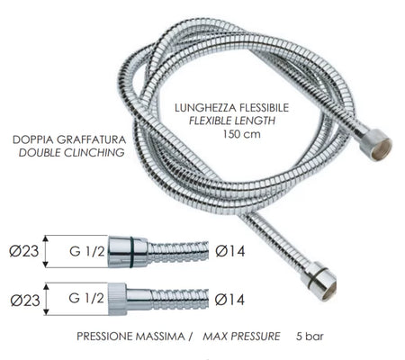 - Fleksibilno rastegljivo crevo za tuš sa duplim klinčom od hromiranog mesinga, Ø 14, sa jednom konusnom maticom